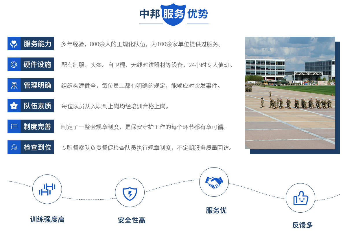 中邦服務(wù)簡介 安徽中邦保安服務(wù)有限公司總公司成立于2019年。公司 成立以來,始終以“文明值勤、優(yōu)良服務(wù)、客戶至上、安全為先” 為宗旨,以保一方平安為已任,面向社會各界等提供有償保安護 衛(wèi)、技術(shù)防范、保安培訓(xùn),是一家專業(yè)化保安服務(wù)公司。目前, 公司下為200多家客戶單位提供周到安全的保安服務(wù),遍布全省 及周邊地區(qū),現(xiàn)有各類專業(yè)人員和保安員2000余名。 中邦服務(wù)宗旨 安徽中邦保安服務(wù)有限公司是為適...
